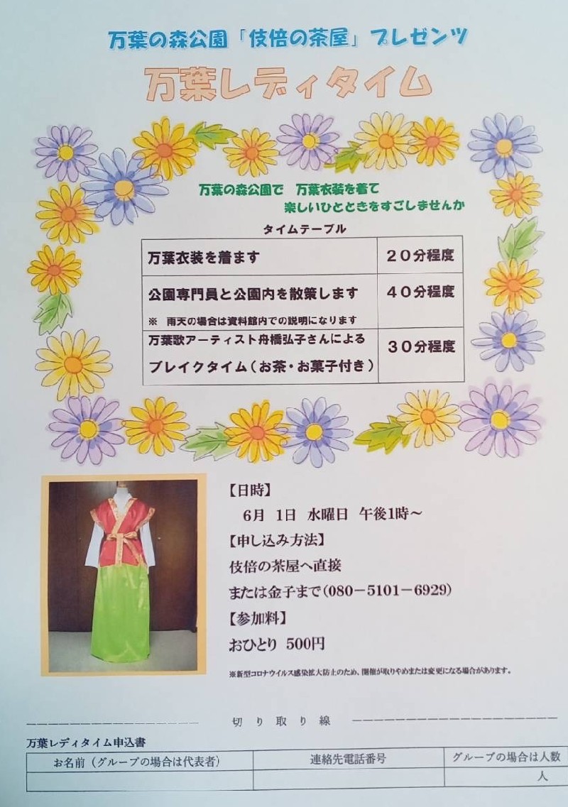 | 6月 1日(水)13:00〜14:30 万葉レディタイム 万葉衣装を着て、楽しいひと時を! |